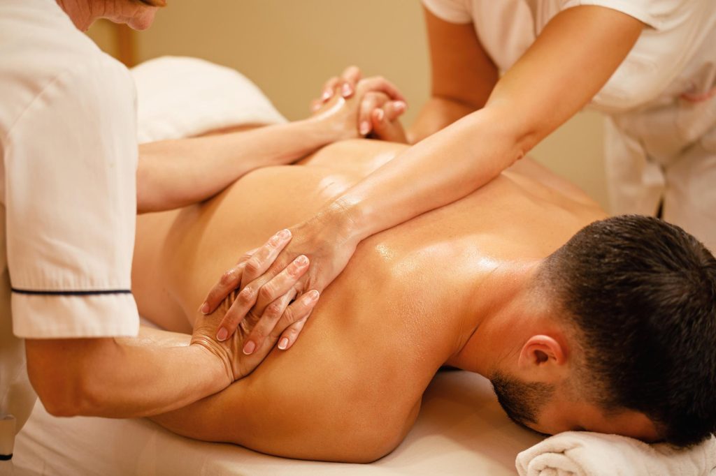 A four hands massage, also known as a synchronized massage or duo massage, is a type of massage therapy where two massage therapists work on the client at the same time. This technique creates a unique and immersive experience as the therapists coordinate their movements to provide a synchronized and rhythmic massage.During a four hands massage, the two therapists will usually mirror each other’s movements, applying various techniques such as long and flowing strokes, kneading, tapping, and stretching. The synchronized movements not only help to relax and loosen tight muscles but also provide a deeply calming and luxurious sensation.